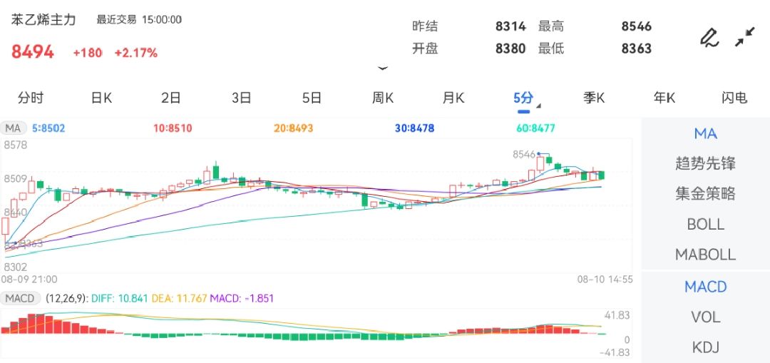 8月10日,邦内商品期市大都上涨,此中,苯乙烯期货主力合约开盘报8380元/吨,今日盘中高位颠簸运转;截至发稿,苯乙烯主力最高触及8546元,下方探低8363元,涨幅达2.31%相近。