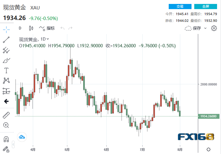美市尾盘,现货黄金收报1934.26美元/盎司,下跌9.76美元或0.50%,盘中最高触及1954.79美元,最低触及1932.90美元。