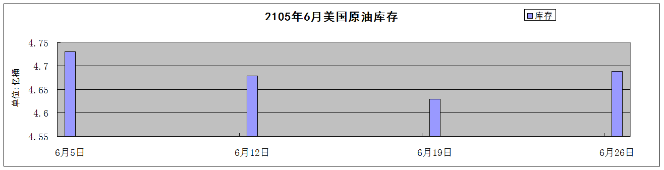 第一,美邦库存回升拖累油价。美邦原油库存正在贯串八周降落后,毕竟回升(睹下图),但汽油库存补充盖过原油库存节减,使库存呈报对油市的影响为中性。按照美邦能源材料协会(EIA)揭晓的6月原油库存数据,5日为4.731亿桶,比前一周降落670万桶;12日为4.6793亿桶,比前一周降落270万桶;19日为4.6299亿桶,比前一周降落490万桶;26日为4.68861亿桶,比前一周补充187.5万桶,这一补充成为触发美邦原油价值下跌的首要原由。