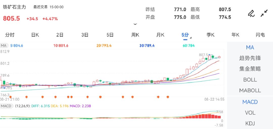 8月22日盘中,邦内期货主力合约涨跌互现。此中,铁矿石期货主力合约开盘报775.0元/吨,今日盘中高位惊动运转;截至收盘,铁矿石主力报收于805.5元/吨,涨幅达4.47%。