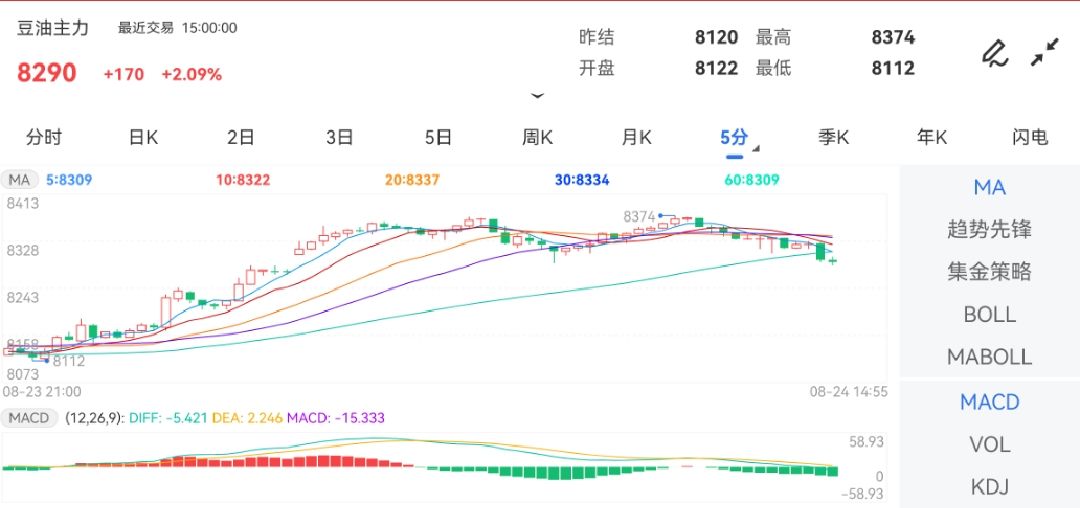 8月24日盘中,豆油期货主力合约遇到一波急速上行,最高上探至8374元。截止发稿,豆油主力合约报8366元,涨幅3.03%。