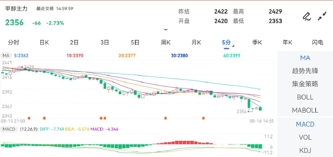 8月16日,邦内期货主力合约涨跌纷歧。此中,甲醇期货主力合约开盘报2420元/吨,今日盘中低位颠簸运转,早盘收跌1.28%;截至发稿,甲醇主力最高触及2429元,下方探低2353元,跌幅达2.73%。