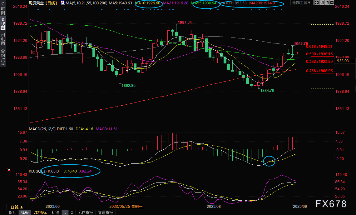 但是,因为KDJ也发出了短线超买信号,金价此前也受到了100日均线阻力压制,也未能有用打破前期跌势的38.2%回撤位1948.31枢纽身分,假设金价回落至55日均线下方,则减少后市看涨信号;10日均线日均线日均线支柱也正在该身分相近,假设失守该支柱,则推广后市看空信号。