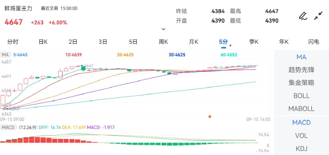 9月15日,邦内期货主力合约简直全线上涨。此中鸡蛋期货高开高走,盘中一度触及涨停,革新本年一月以后新高。截止发稿鸡蛋主力合约报4612元,涨幅达5.20%。