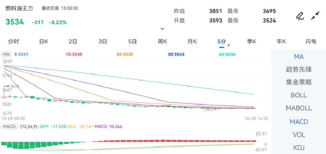 10月9日,邦内期市原油系全线飘绿,燃料油、原油主力跌逾7%。全部来看,截止目前,燃料油主力下跌7.71%,报3554元/吨;原油主力下跌7.77%,报657.8元/桶;液化石油气主力下跌3.04%,报5413元/吨;沥青主力下跌4.63%,报3770元/吨;低硫燃料油主力下跌6.45%,报4527元/吨。