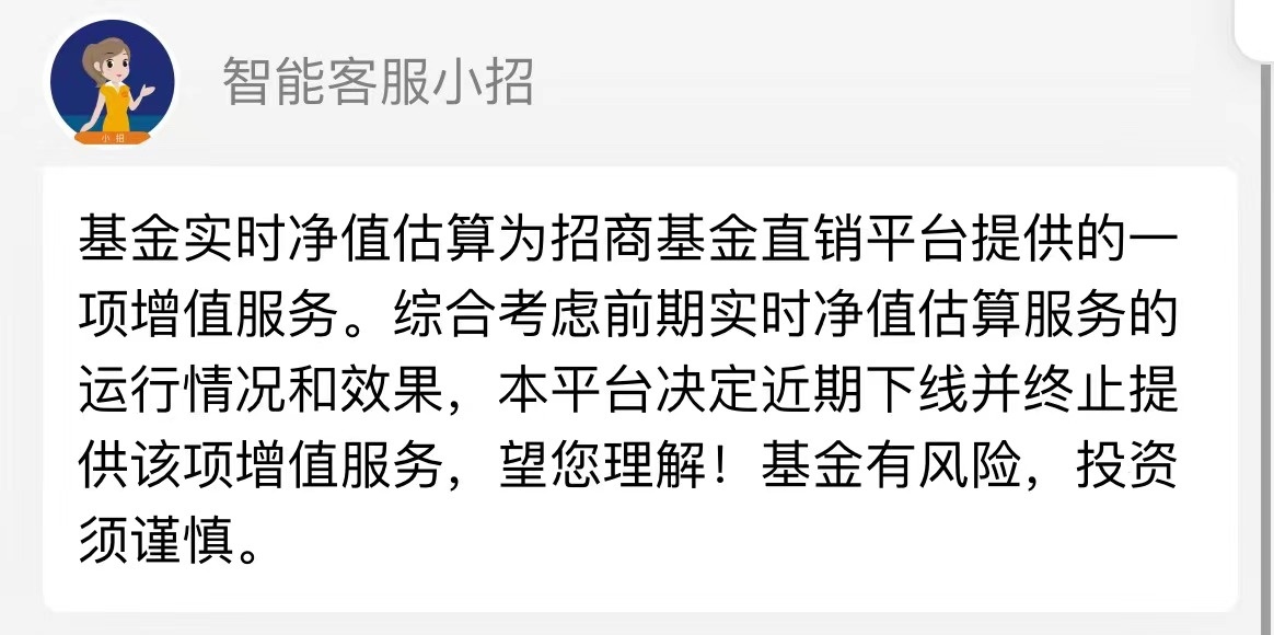 除了银行外,基金公司直销app也接踵下线了该供职。招商基金智能客服体现,归纳商量前期及时净值估算供职的运转情形和效益,平台确定近期下线并终止供给基金及时净值估算供职。