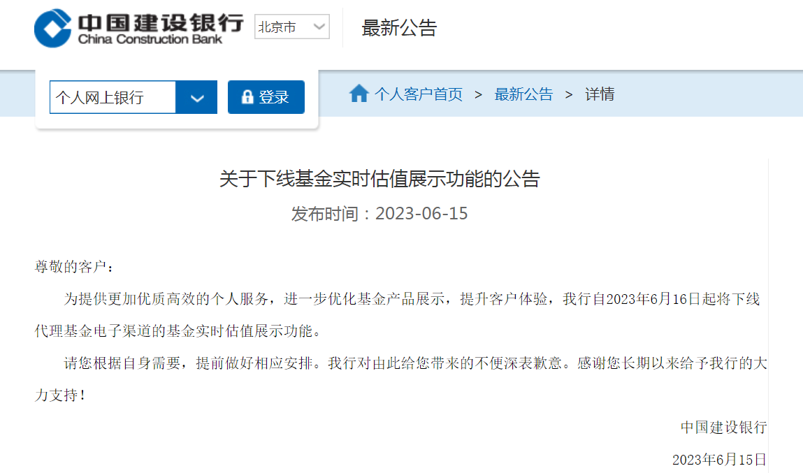 6月15日,维护银行布告体现,为供给尤其优质高效的部分供职,进一步优化基金产物显示,提拔客户体验,自2023年6月16日起将下线署理基金电子渠道的基金及时估值显示功效;宁靖口袋银行app显示,因盘中估值与确凿净值存正在肯定不同,为保险投资历程食用音讯的无误性,请以基金公司实质披露的净值为准,筹划于6月16日零点下线盘中估值,届时不再供给估值以及相干指挥供职。
