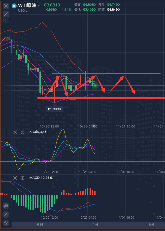 原油从日线上来看,日线上来看,布林带有收口迹象,价值连接几日收到中轨一线的压制,这也是上周继续做空的名望,日内不停闭切中轨的压力名望,也即是85一线。四小时方面,布林带收口,价值庇护于中轨相近振撼,四小时方面正在82相近众次下探回升,是以也不行过分看空,起码依然一个拉锯振撼,是就此位之上盘底回升依然蓄势破位有待视察,本周照样中心介意区间打破,操作思绪上依然以高空为主!