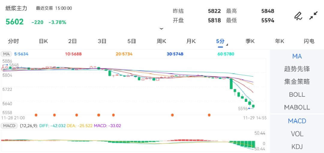 本站易记网址:投诉建议邮箱:!国际黄金实时行情金投网APP行情中央数据显示,截止2023年11月29日下昼15:00收盘,纸浆期货主力合约行情讯息:最新价:5602,涨跌:-220,涨跌幅:-3.78%,成交量:515035手,开盘价:5818,昨收价:5818,最高价:5848,最低价:5594。