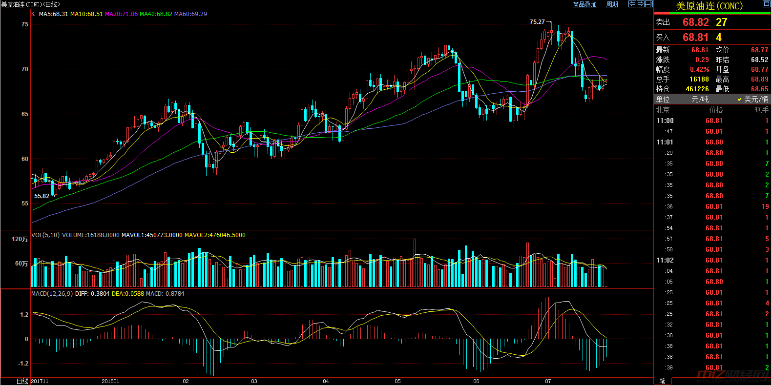 美原油主力日线.美原油:日线日)盘面收阳,收盘价站于MA5上方;均线、MA60死叉向下且走势趋稳,短期商场交投空气回暖;成交量来看,上个来往日商场成交小幅缩量,投资者买入来往为主;DIFF、DEA死叉向下运转,绿柱延续缩短;归纳来看,短期美原油主力或仍有反弹空间。