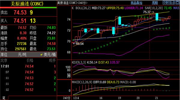 原油行情走势解析:周三原油三次75闭口进场空单,最终结果胜利下跌拿到利润,尾盘低点更是给到73.5一线。回归今日行情来看,目前小时线小时线、日线盘面周期SAR停损转向目标同时出今朝底部向上起色,短线走势偏众无疑。及时原油现报价74.2一线地位,差错带目标上轨延迟至76闭口,更上方阻力参考周线地位。