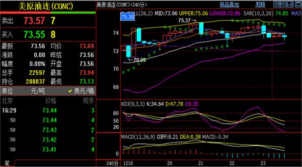 带你走上财富增值之路Wednesday, December 27, 2023原油及时行情判辨:周二原油开盘略微高开,后续走势回归阴跌,早盘提示过的74-74.2区域阻力清楚承压。本领面上周线MACD绿色动能柱动手缩量,然而彻底反转还须要时辰周期运作后才可以结束。本周的防守阻力参考周线相近,只消油价没实体上破之前,思途优先依旧看空稳固。日线区间内,看不出清楚倾向。4小时图形中布林带上轨根本重合SAR目标延迟点承压74.8一线,及时油价处于布林带中轨74.1下方运转,且布林带下轨向下发散,日内短线走势偏空应付。小时线盘面上布林带中轨与小时线区域,白盘思途很单纯,反弹不行实体上破74.2相近优先看空。