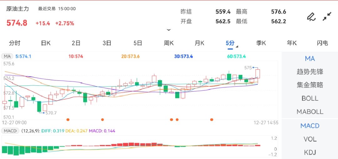12月27日,邦内期市能化板块涨跌互现。此中,原油期货主力合约开盘报562.5元/桶,今日盘中高位震动运转;截至发稿,原油主力最高触及576.6元,下方探低562.2元,涨幅达2.59%相近。