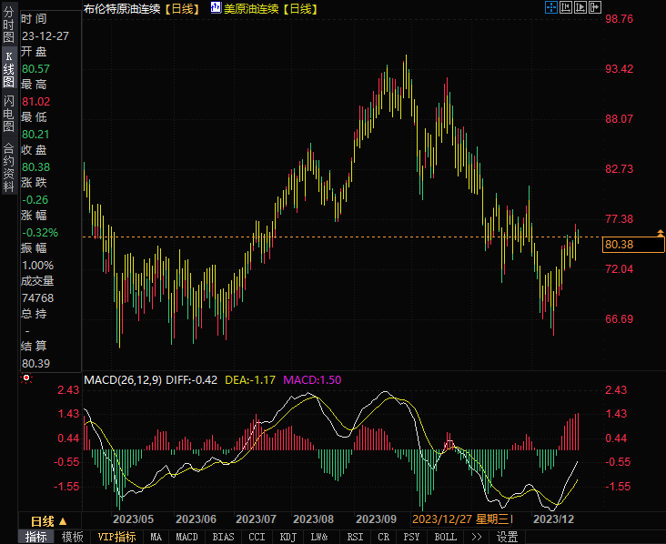 至每桶80.38美元;美国西德克萨斯中质原油下跌0.36美元—油价涨跌最新消息汇通财经APP讯——正在红海地域的事态兴盛激励投资者闭切的景况下,邦际油价正在周三(12月27日)企稳。只管中东地域时势急急,但大型航运公司正正在慢慢还原通过红海的航路。