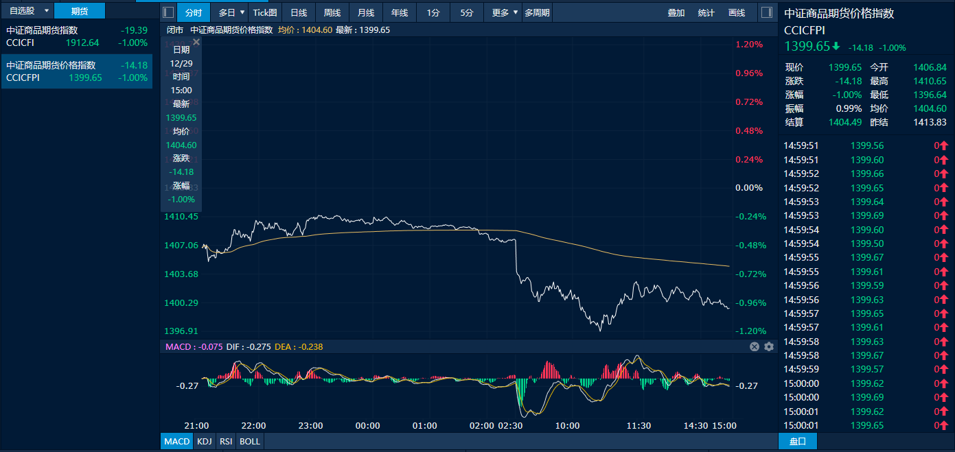 截至29日下昼收盘时,追踪邦内商品墟市的中证商品期货价钱指数收报1399.65点,较前一往还日下跌1.00%;中证商品期货指数收报1912.64点,较前一往还日下跌1.00%。