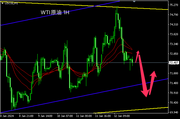 原油短线H)走势冲破区间上沿测试75.20,随即受阻下降,先扬后抑的节律。具体的节律坚持正在宽幅通道内,早盘油价下穿均线编造,向通道下沿测试,估计日内原油下测通道下方,正在71相近从新获支柱反弹。