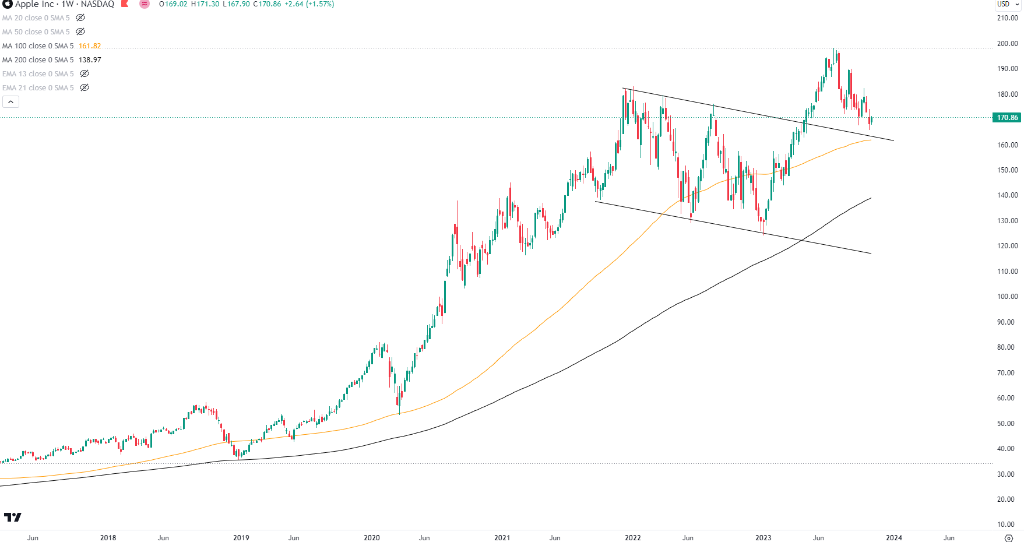苹果股价本年累计“仅”上涨36%,固然涨幅正在美邦前七大龙头股(Magnificent 7)中垫底,但周线周均线的上方,上升趋向仍旧无缺。若价值能正在旗形拾掇形状上沿回踩确认维持,后市希望延续上行节拍。