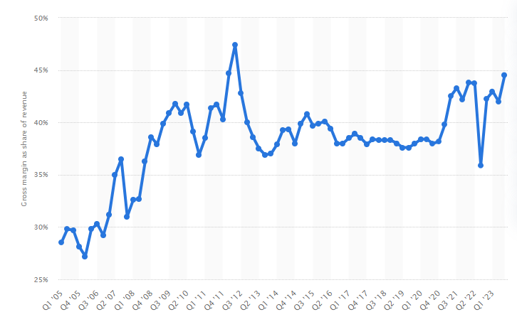 苹果的任职板块关键搜罗广告、AppleCare、云任职、数字实质、支出任职等。其总收入正在二季度创史书新高,25%的营收占比更是转换出高达70.5%的毛利率,远高于硬件产物(35.4%)和公司全部的毛利率秤谌(44.5%)。换句线美元来自于任职板块,这一比例若很疾升至50%并不会令人感触不测。