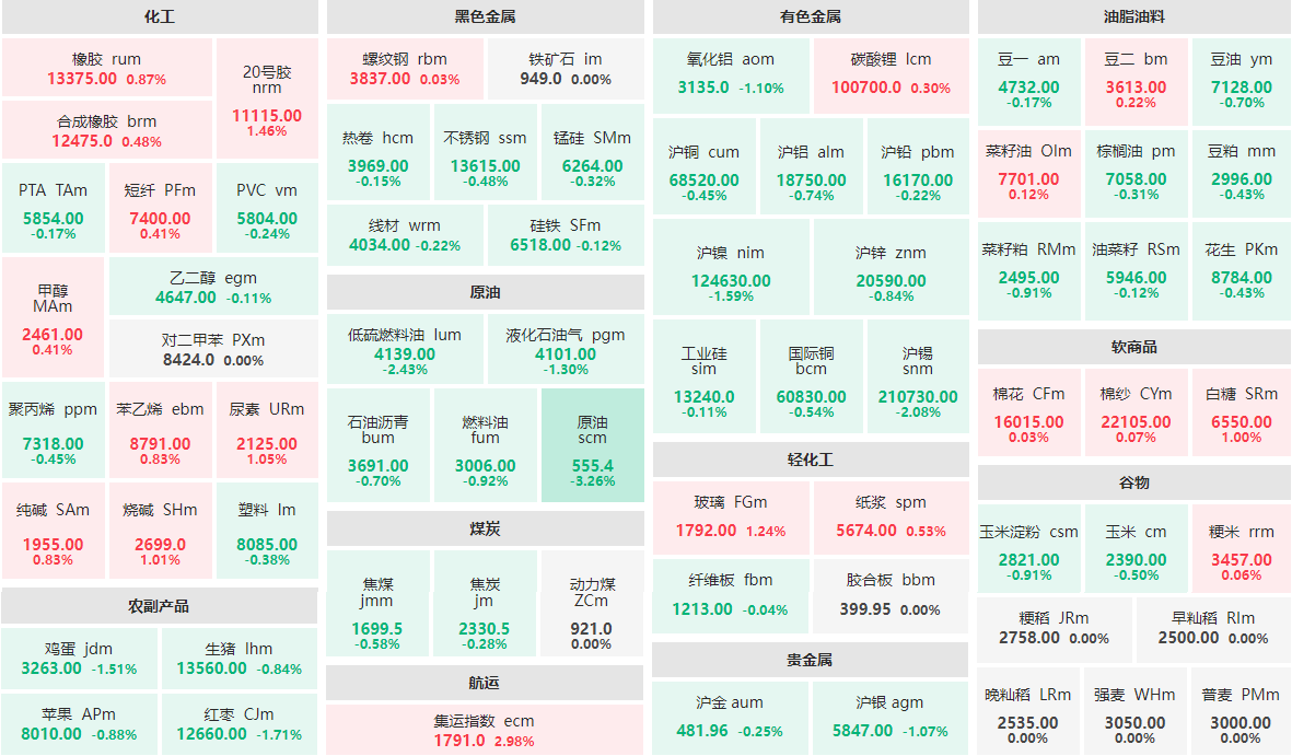 2月5日早盘收盘,邦内商品期货主力合约跌众涨少,化工、轻化工众半飘红,玄色、有色、油脂油料、煤炭、谷物商场众半飘绿,软商品全线飘红,原油系、农副产物、贵金属全线飘绿。个中,原油主力跌逾3%。