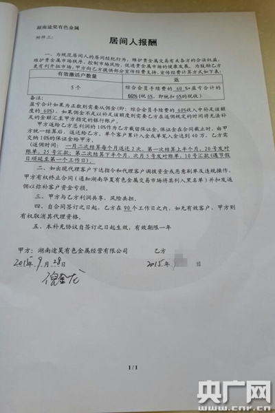 一位不肯泄露姓名的途昊公司居间人向记者出示了一份《居间赞同》,正在其附件中写着:居间人的返点基于投资者的手续费和盈亏合计的60%。按照这份《居间赞同》附件的说明,投资者置备“中国油”的耗损,并没有进入邦际商场,而是直接入了途昊公司治下居间人的口袋。附件上有湖南途昊股东倪金龙的署名,订立时候是9月28日。面临记者的质疑,他先是说不知晓合同细节,之后又说明,如此的合同,早正在三个月前就废止了。