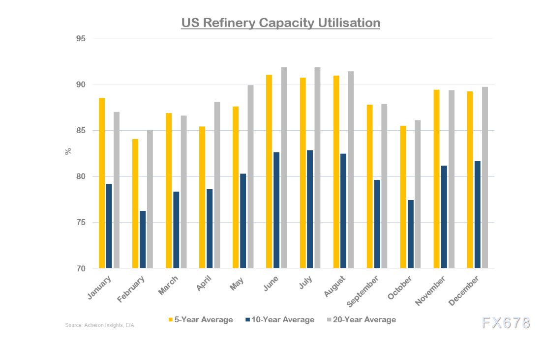 其次,时令性要素正在爆发变更。时令性要素是近期原油价值暴跌的原由。从史书来看,10月和11月原油和能源价值最低迷的月份,这一岁月正在北半球夏令驾驶时令之后,跟着炼油厂维修量扩充,炼油厂的产能愚弄率下滑。