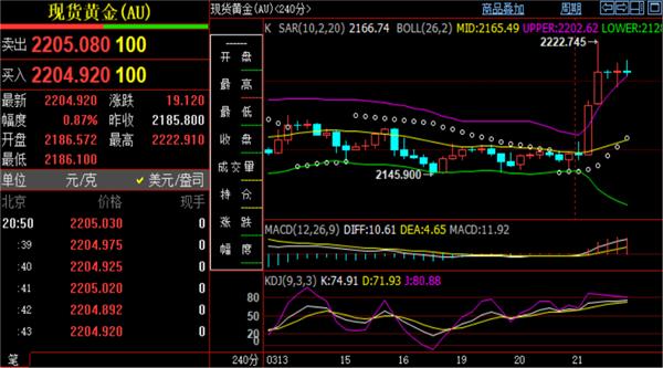 黄金及时行情剖释:凌晨发布的美联储将基准利率联贯第五次保护正在5.25%-5.50%区间褂讪,适合商场预期。这个信息利好金价,导致今日开盘暴涨创下积年新高达到2222一线,目前金价有所削弱,及时现报价2208一线小时线和日线周期图形布林带和均线都向上起色,加上利率决议发布利好音信,短时分黄金的价钱难以回落,目前暂定小时线整数合口领域运转对于,向下破位2200能力去参考小时线职位行为撑持点。
