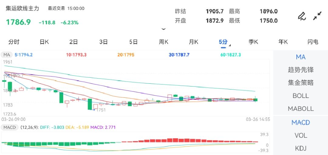 集运指数(欧线)期货主力合约行情信息:最新价:1786.9Thursday, March 28, 2024金投网APP行情核心数据显示,截止2024年3月26日下昼15:00收盘,集运指数(欧线)期货主力合约行情音信:最新价:1786.9,涨跌:-118.8,涨跌幅:-6.23%,成交量:31492.0手,开盘价:1872.9,昨收价:1922.9,最高价:1896.0,最低价:1750.0。