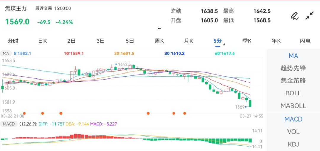 3月27日盘中,焦煤期货主力合约遇到一波急速下挫,最低下探至1589.5元。截止发稿,焦煤主力合约报1592.5元,跌幅2.81%。