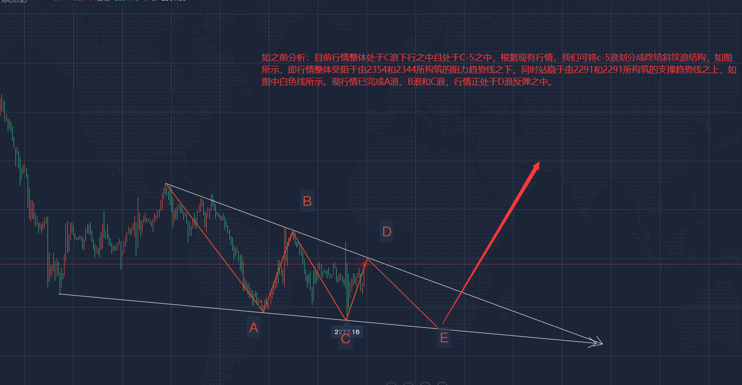 黄金斜纹浪构造:由大一级另外海浪构造可知,行情正处于c-5浪下行之中,按照现有行情,咱们可将c-5浪划分成终结斜纹浪构造,如图所示,即行情整个受阻于由2354和2344所修筑的阻力趋向线所修筑的支柱趋向线之上,如图中白色线所示。现行情已达成A浪、B浪和C浪,行情正处于D浪反弹之中,目前1小时周期于阶段阻力趋向线相近录得大阳线后再次录得阴线修筑乌云盖顶样式,短线反弹结果,即D浪反弹结果,后市进入E浪下行之中!