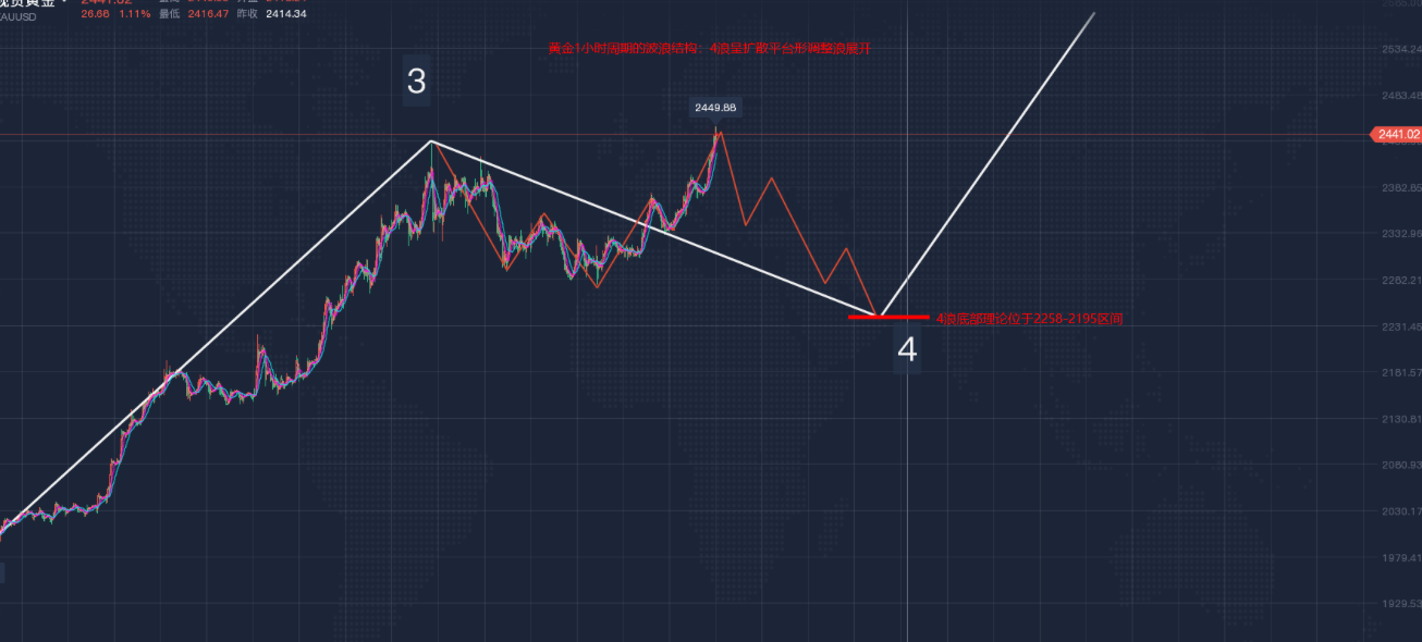 黄金海浪布局:如之前阐述,因大一级另外2浪呈锯齿浪安排布局,依照海浪表面的瓜代法则可知,自2431起的4浪将呈横线安排布局,现行情已告竣4-a浪,现行情于阶段性高点2449录得反转样式,故咱们可讯断4-b浪于2449相近反弹了局,后市进入4-c浪下行之中。因4浪呈横向安排且4-b浪已超越4-a浪的出发点且已跨越4-a浪的105%,故师长讯断4浪具体将呈扩散平台形安排浪睁开,即4-c浪的尽头将跨越a浪的尽头即2277。依照海浪表面推演可知:4-c浪表面底部位于2377-2195区间,同时4-c浪将可能视为一个鼓动浪即可细分成5浪布局,后续咱们再全体阐述。
