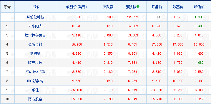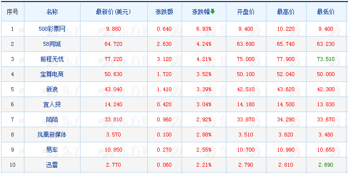 中邦互联网金融效劳涨15.25%,点牛金融涨10.81%,趣店涨4.7%,58同城涨4.31%,蔚来汽车涨3.83%,网易涨2.03%;品钛跌31.71%,盛世乐居跌13.43%,美美证券跌6.81%。