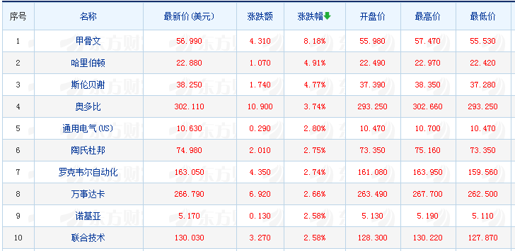 美邦能源股全体大涨,埃克森美孚涨1.71%,雪佛龙涨1.13%,康菲石油涨1.78%,斯伦贝谢涨4.77%,EOG能源涨3.19%。