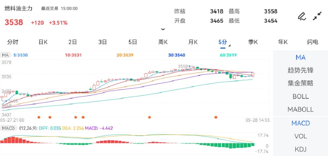 5月28日,邦内期市原油系板块全线飘红。此中,燃料油期货主力合约开盘报3465.00元/吨,今日盘中高位波动运转;截至发稿,燃料油主力最高触及3545.00元,下方探低3454.00元,涨幅达3.57%相近。