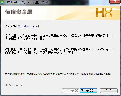 1、正在PC下载网将恒信贵金属黄金贸易平台下载下来,并解压到目下文献夹中,点击个中的hxpm4setup.exe运用秩序,进入安置引导界面,接着点击下一步。