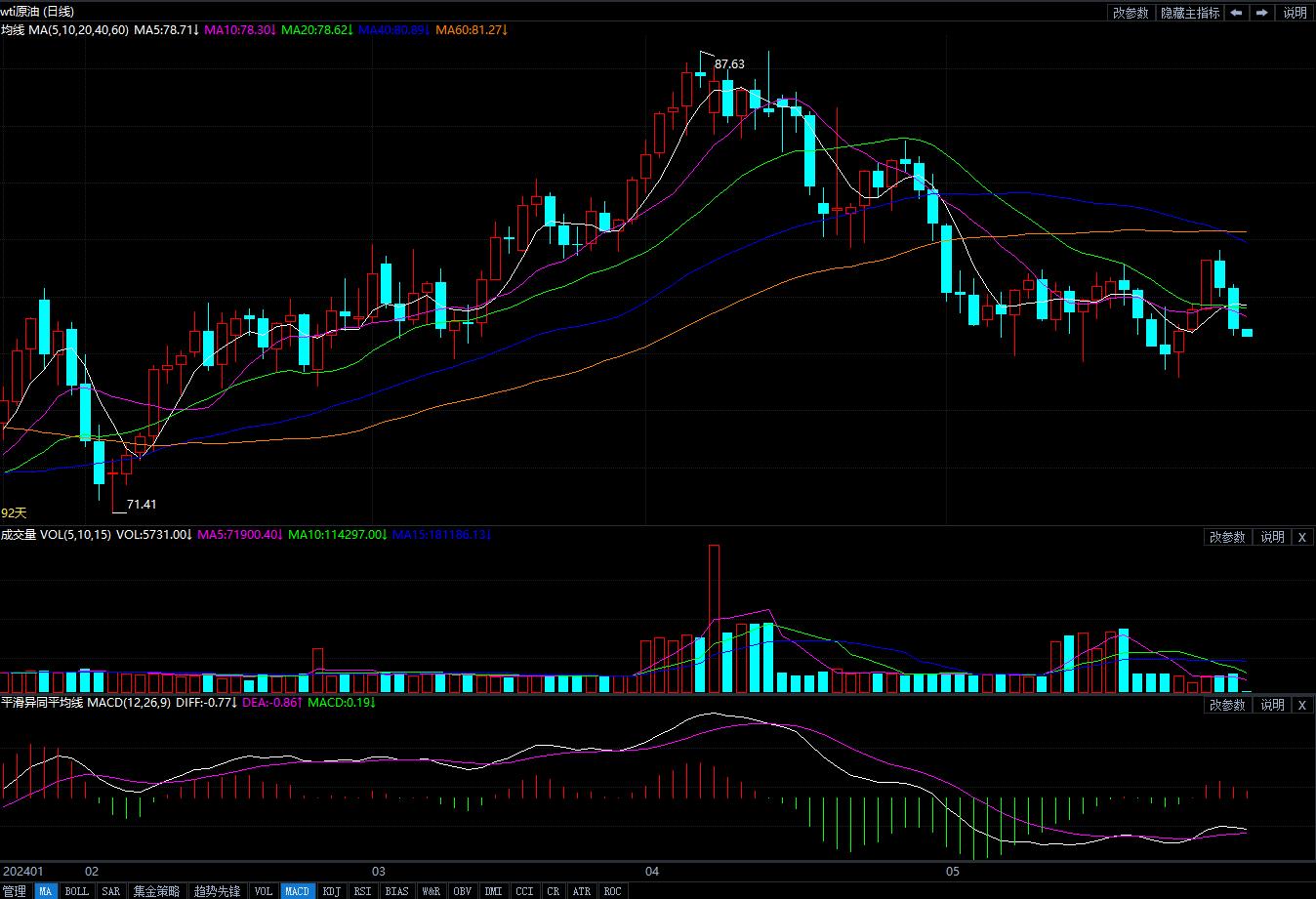 原油走势分解:油价跌回80美元下方,冲破技艺支持,从日线图级别看,均线体例呈发散下行,中期客观趋向呈下手脚主。油价受到均线体例的压造,反弹无果后下行革新低76.50。通盘5月油价三次触及新低后被反弹收复。估计后市中期走势仍坚持再三振撼下降节拍为主。