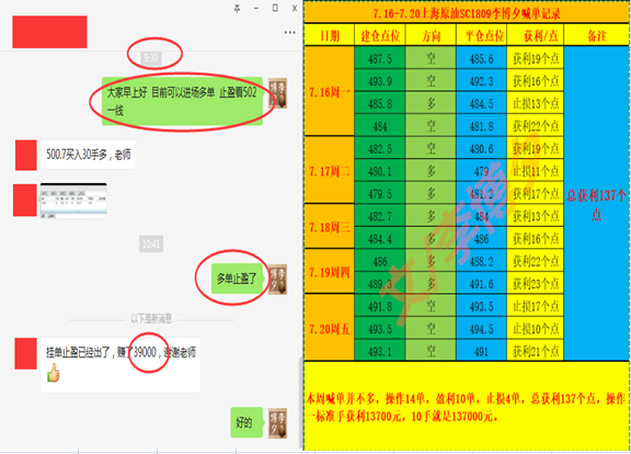 7.25上海原油期货SC1809早盘喊轶群单,500.7买入30手止盈502,赢利13个点,操作一圭表手赢利1300,十手13000元,三十手便是39000元,操作一手所需保障金4000。附7.16-7.20原油期货喊单记实,上周总喊单14单,赢利10单,止损4单,总赢利137个点。更众实盘解读眷注博夕唯辛,中长线结构。