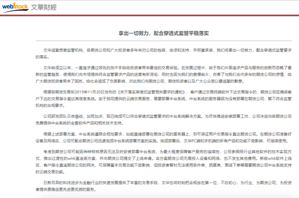 截至1月11日,包含中信期货、海通期货、永安期货、南华期货、中粮期货等横跨20家期货公司稠密颁布布告称,将于1月20日或1月17日暂停应用文华财经系列众个交往软件,应用文华软件的投资者,将无法实行交往登录,无法应用盘查和交往等效用。