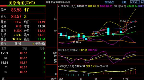 原油及时行情阐发:本周原油日K线一线。技巧面上原油价钱即将触及4小时布林带上轨阻力点83.7一线均线一线,刘铭诚估计今日美盘前夜触及83.7-84.2区域能平常做空看回落修复目标。目前光阴来到欧盘时段,原油先看小时线小时附图目标上MACD赤色动能柱发端缩量,KDJ随机目标处于超买区域,既然价钱靠拢高位阻力范畴,那么筑仓思途就维持反弹做空为主。