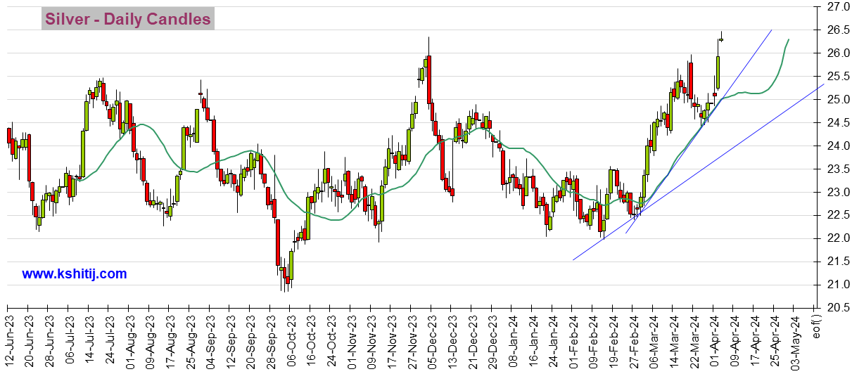 白银期货昨日如预期般上涨到26.30美元/盎司,今日又进一步上涨到26.50美元/盎司。白银期货看起来会进一步涨向27.00-27.50美元/盎司。