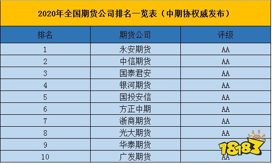 期货公司每年城市有排名,让咱们看看2020年全邦期货排名前十的公司吧。排名从第一名到第十名,顺次是永安期货、中信期货、邦泰君安、银河期货、邦投安信、刚直中期、浙商期货、光大期货、华泰期货、广发期货。可能看到前十名都是AA级期货公司,值得相信。