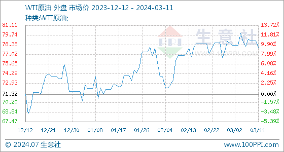 美原油最新行情生意社WTI原油基准价为78.93美元/桶3月11日,生意社WTI原油基准价为78.93美元/桶,与本月初(78.54美元/桶)比拟,上涨了0.50%。