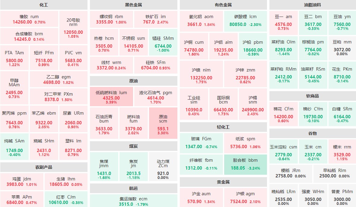 8月1日午盘收盘,邦内商品期货主力合约众半走跌,化工、玄色金属、有色金属、农副产物板块众半飘红,油脂油料、煤炭、轻化工、软商品、谷物板块众半飘绿,原油系、贵金属板块全线飘红。