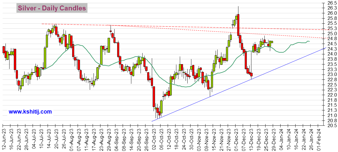 白银期货正在25.00-24.00美元/盎司区间内上升。若决断性地冲破25美元/盎司,这或许为白银期货升向25.30-25.50美元/盎司铺平门道。