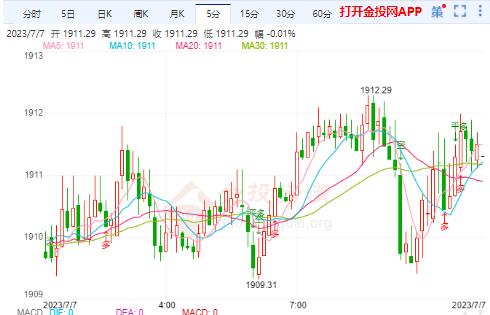 周五(7月7日)本贸易日黄金期货开于1910.81美元/盎司,最高上探至1912.29美元/盎司,最低触及1909.31美元/盎司,截至发稿暂报1910.39美元/盎司,跌幅0.02%。