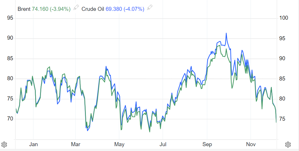 智通财经APP获悉,北美原油订价基准——WTI原油期货价值正在周三下跌超4%,跌破每桶70美元大闭,收于6月底以后的最低秤谌,同时美邦汽油零售价值正在圣诞假日购物季和旅逛时令到来之前触及1月份以后的最低点。数据显示,成交量最高的WTI原油1月期货合约下跌2.94美元,收于每桶69.38美元,跌幅高达4.07%;邦际原油基准——布伦特原油2月期货合约下跌2.90美元,收于每桶74.16美元,跌幅抵达3.94%。