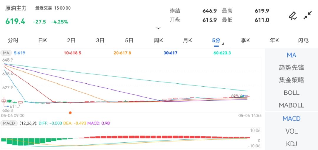 金投期货网提供今日美原油期货价格行情_最新美原油期货报价查询(2024年5月7日)等外盘期货相关行情报价信息?外盘期货直播间喊单金投网APP行情中央数据显示,截止2024年5月6日下昼15:00收盘,原油期货主力合约行情消息:最新价:619.4,涨跌:-27.5,涨跌幅:-4.25%,成交量:39380.0手,开盘价:615.9,昨收价:645.8,最高价:619.9,最低价:611.0。