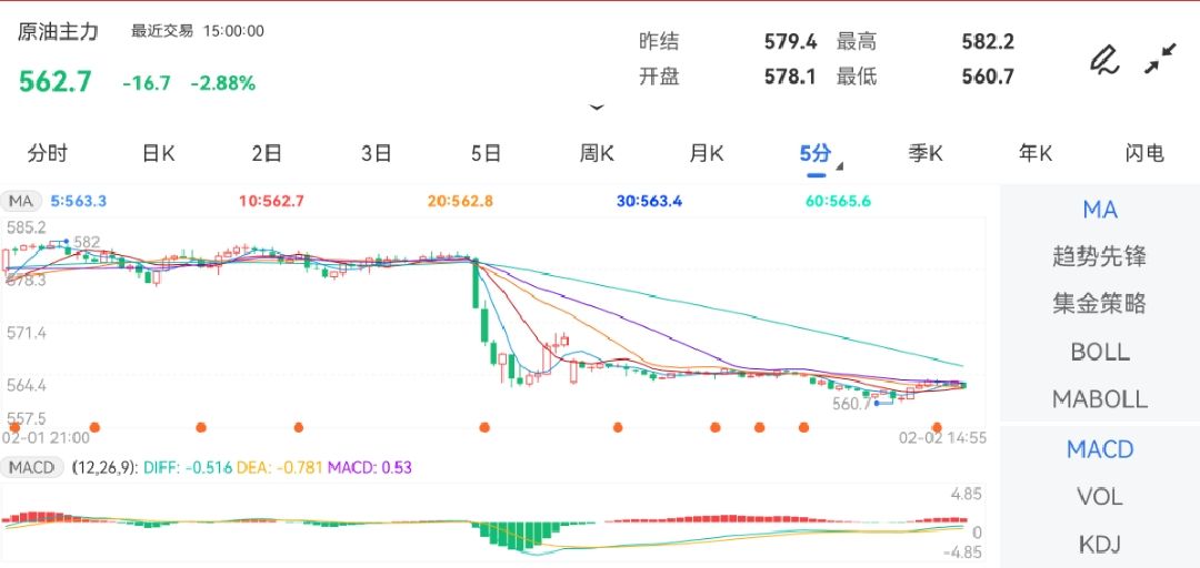2月2日盘中,原油期货主力合约际遇一波急速下挫,最低下探至562.6元。截止发稿,原油主力合约报564.3元,跌幅2.61%。