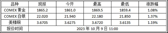 第一黄金网讯 北京时间10月9日—今日原油行情走势第一黄金网讯 北京功夫10月9日,COMEX黄金今日开盘1861.0美元/盎司,最高上探至1869.5美元/盎司,最低触及1859.4美元/盎司,截至发稿报1865.2美元/盎司。