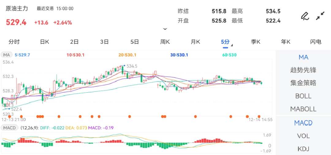 开盘价:525.8!原油期货实时行情走金投网APP行情核心数据显示,截止2022年12月14日下昼15:00收盘,原油期货主力合约行情讯息:最新价:529.4,涨跌:13.6,涨跌幅:2.64%,成交量:170471手,开盘价:525.8,昨收价:527.4,最高价:534.5,最低价:522.4。