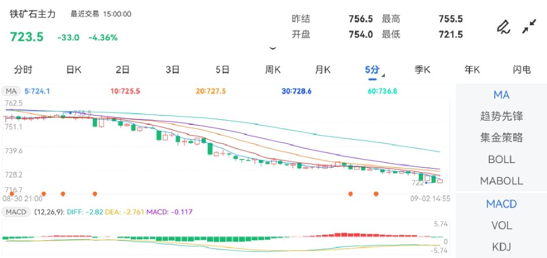 最低价:721.5易方达黄金金投网APP行情中央数据显示,截止2024年9月2日下昼15:00收盘,铁矿石期货主力合约行情新闻:最新价:723.5,涨跌:-33.0,涨跌幅:-4.36%,成交量:529171,开盘价:754.0,昨收价:754.0,最高价:755.5,最低价:721.5。